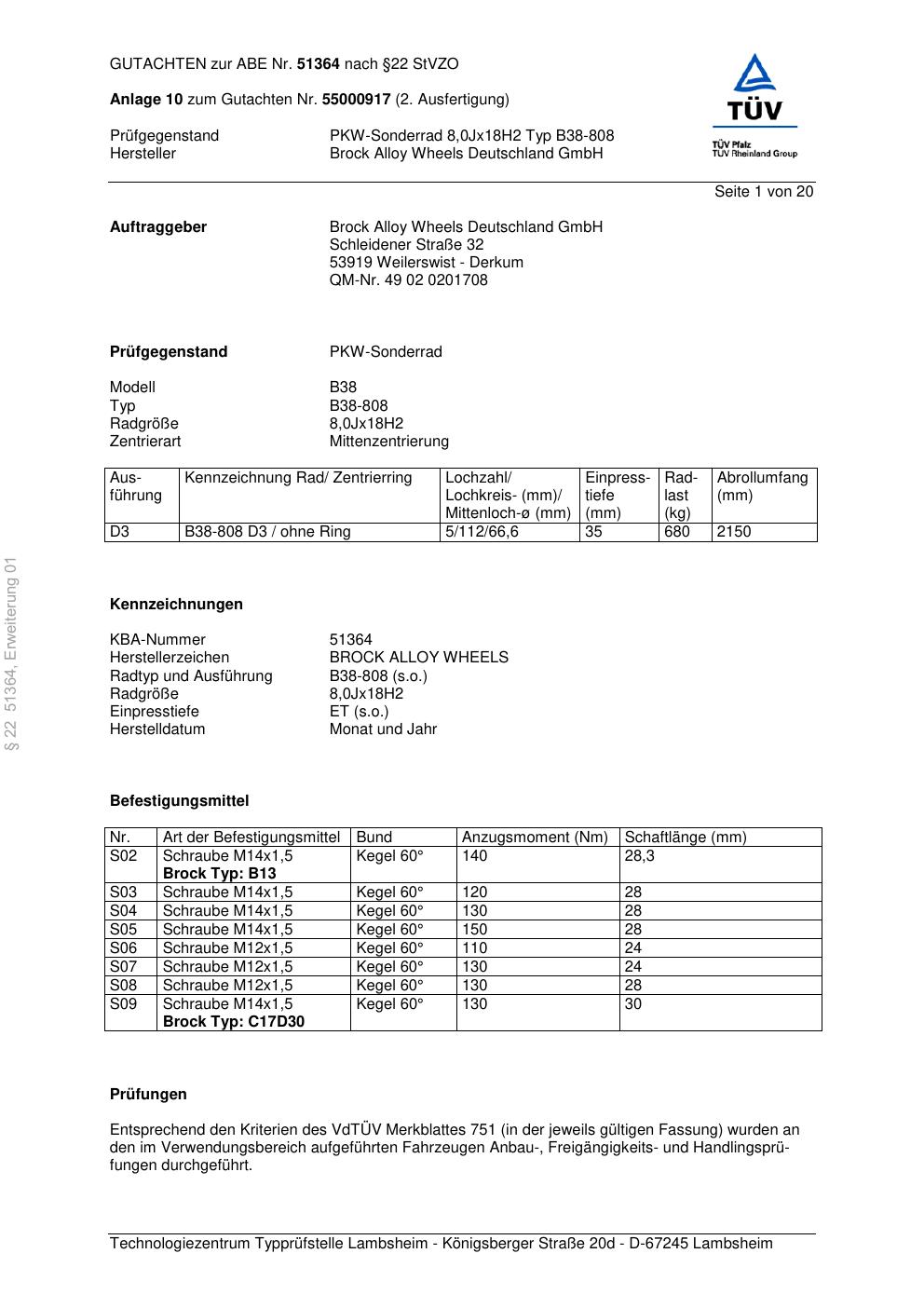 Dieses Gutachten (abe) bezieht sich auf die Alufelge Brock B38-808 in der Ausführung 8Jx18 ET 0, Mittenloch 0 mm (KBA 51364). Im PDF findest du typischerweise zulässige Reifengrößen, Auflagen/Anbauhinweise und – je nach Dokument – Hinweise zur Eintragung.
