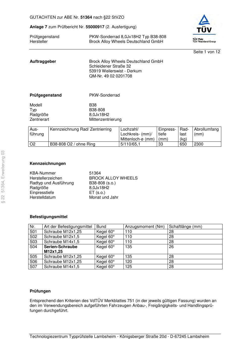 Dieses Gutachten (abe) bezieht sich auf die Alufelge Brock B38-808 in der Ausführung 8Jx18 ET 0, Mittenloch 0 mm (KBA 51364). Im PDF findest du typischerweise zulässige Reifengrößen, Auflagen/Anbauhinweise und – je nach Dokument – Hinweise zur Eintragung.