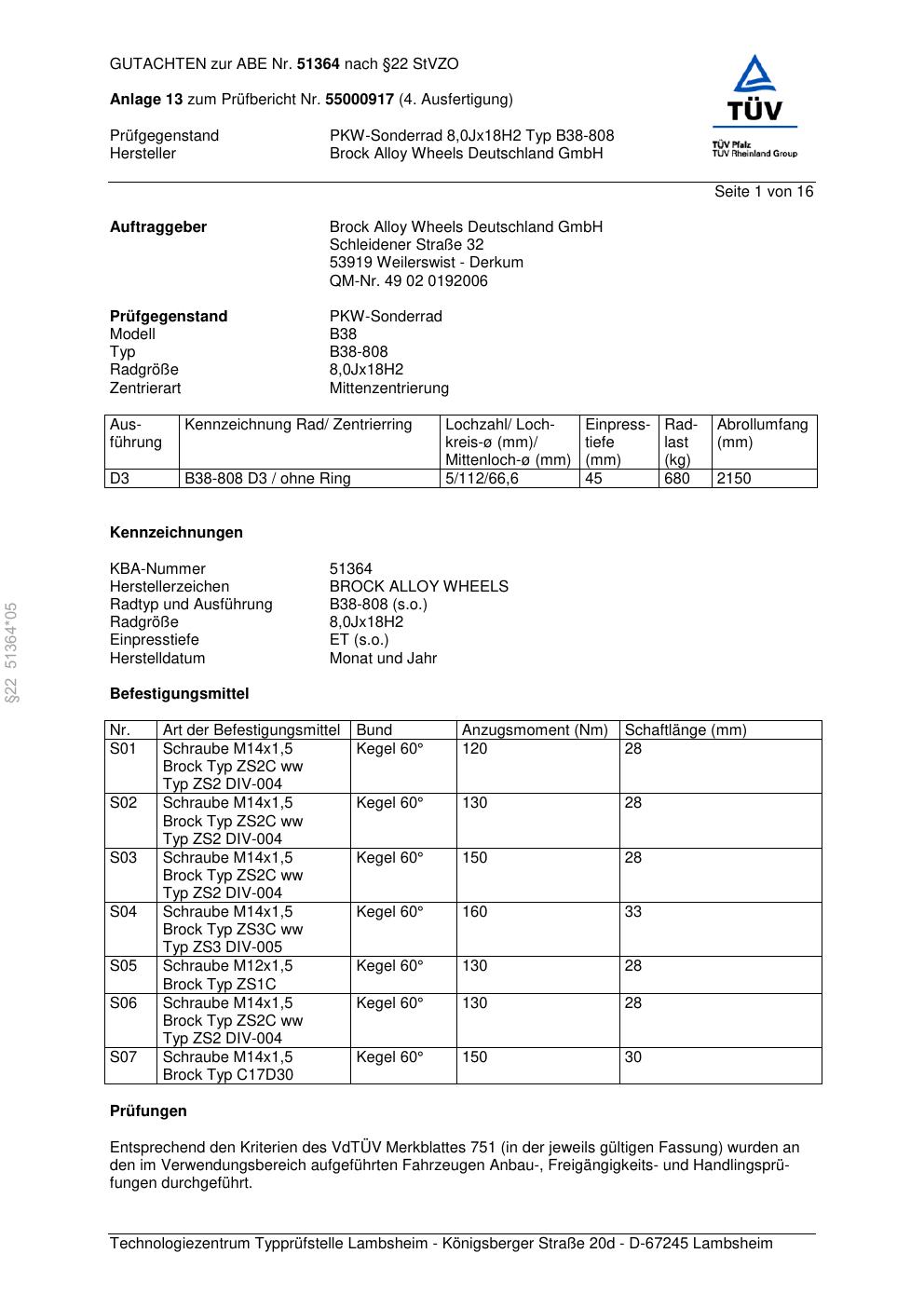 Dieses Gutachten (abe) bezieht sich auf die Alufelge Brock B38-808 in der Ausführung 8Jx18 ET 0, Mittenloch 0 mm (KBA 51364). Im PDF findest du typischerweise zulässige Reifengrößen, Auflagen/Anbauhinweise und – je nach Dokument – Hinweise zur Eintragung.