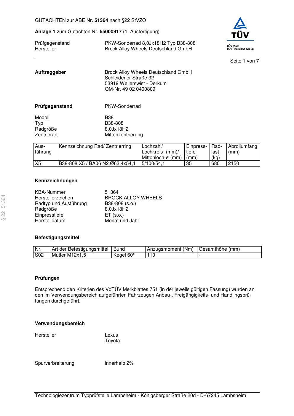 Dieses Gutachten (abe) bezieht sich auf die Alufelge Brock B38-808 in der Ausführung 8Jx18 ET 0, Mittenloch 0 mm (KBA 51364). Im PDF findest du typischerweise zulässige Reifengrößen, Auflagen/Anbauhinweise und – je nach Dokument – Hinweise zur Eintragung.