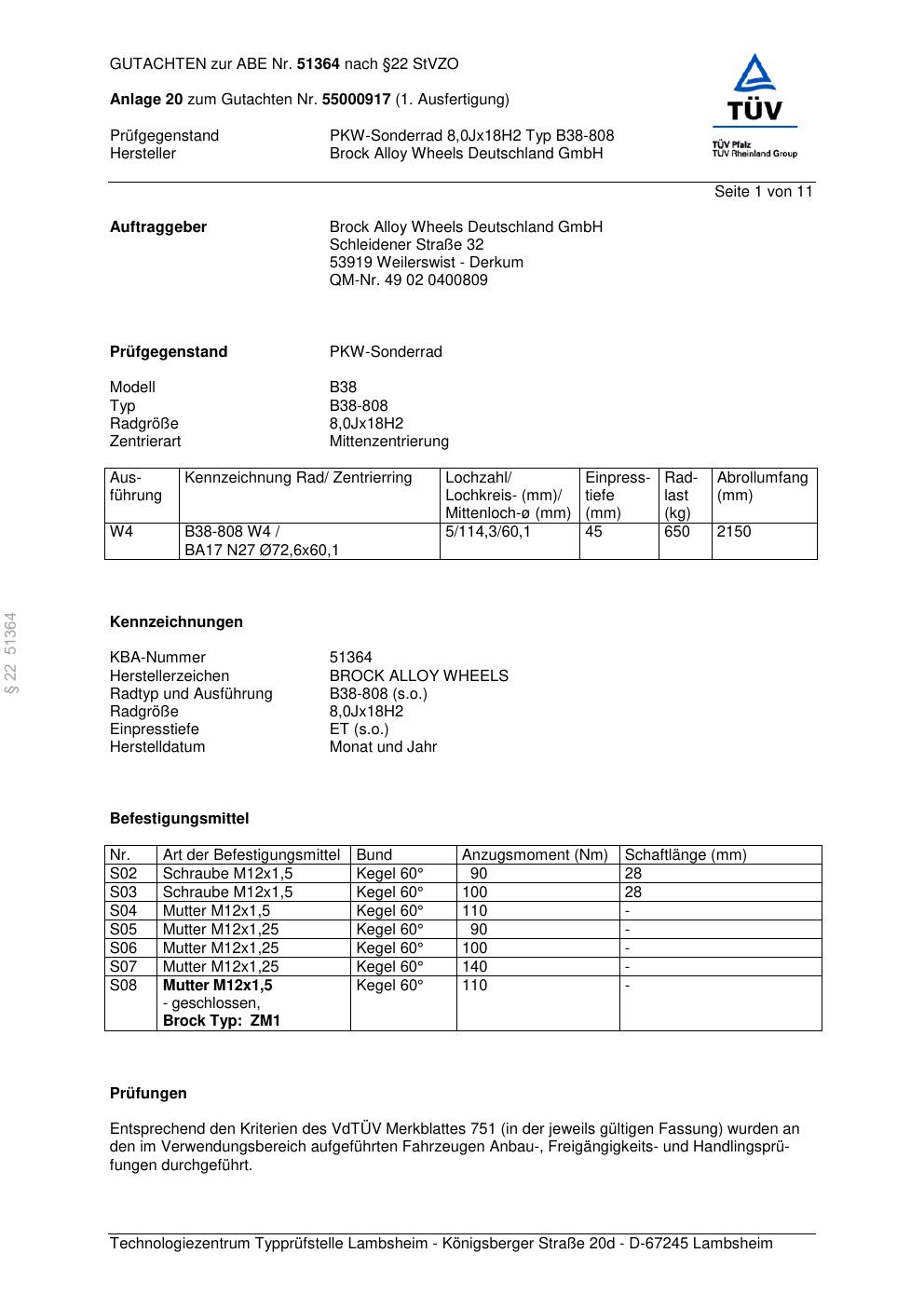 Dieses Gutachten (abe) bezieht sich auf die Alufelge Brock B38-808 in der Ausführung 8Jx18 ET 0, Mittenloch 0 mm (KBA 51364). Im PDF findest du typischerweise zulässige Reifengrößen, Auflagen/Anbauhinweise und – je nach Dokument – Hinweise zur Eintragung.