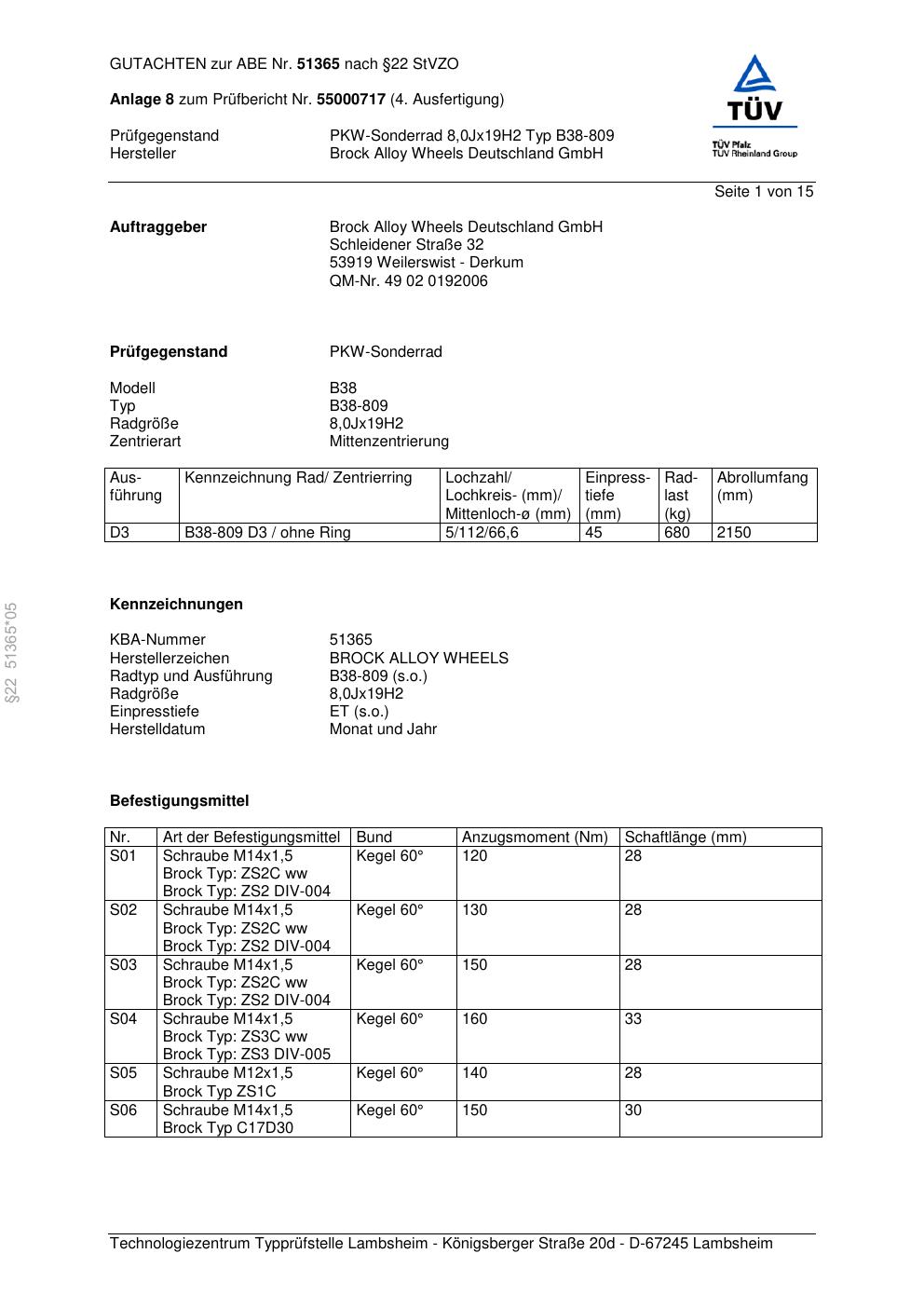 Dieses Gutachten (abe) bezieht sich auf die Alufelge Brock B38-809 in der Ausführung 8Jx19 ET 0, Mittenloch 0 mm (KBA 51365). Im PDF findest du typischerweise zulässige Reifengrößen, Auflagen/Anbauhinweise und – je nach Dokument – Hinweise zur Eintragung.
