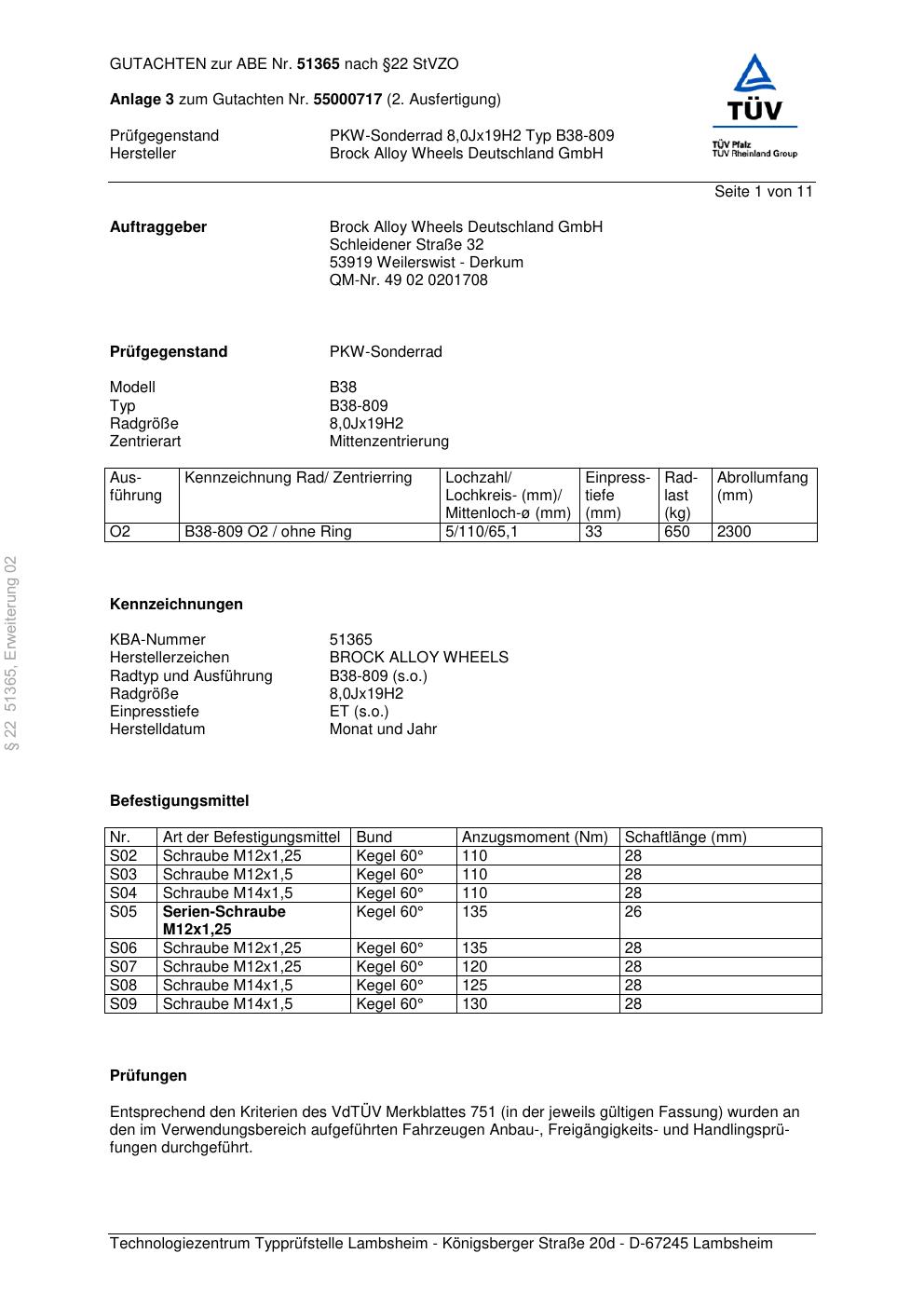 Dieses Gutachten (abe) bezieht sich auf die Alufelge Brock B38-809 in der Ausführung 8Jx19 ET 0, Mittenloch 0 mm (KBA 51365). Im PDF findest du typischerweise zulässige Reifengrößen, Auflagen/Anbauhinweise und – je nach Dokument – Hinweise zur Eintragung.