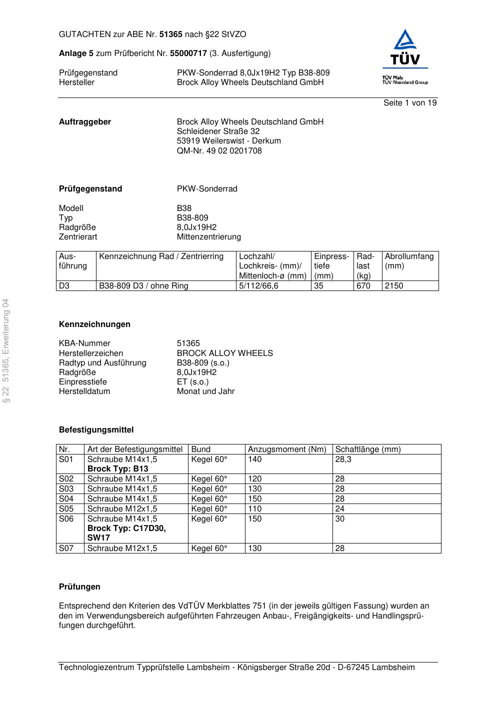 Dieses Gutachten (abe) bezieht sich auf die Alufelge Brock B38-809 in der Ausführung 8Jx19 ET 0, Mittenloch 0 mm (KBA 51365). Im PDF findest du typischerweise zulässige Reifengrößen, Auflagen/Anbauhinweise und – je nach Dokument – Hinweise zur Eintragung.