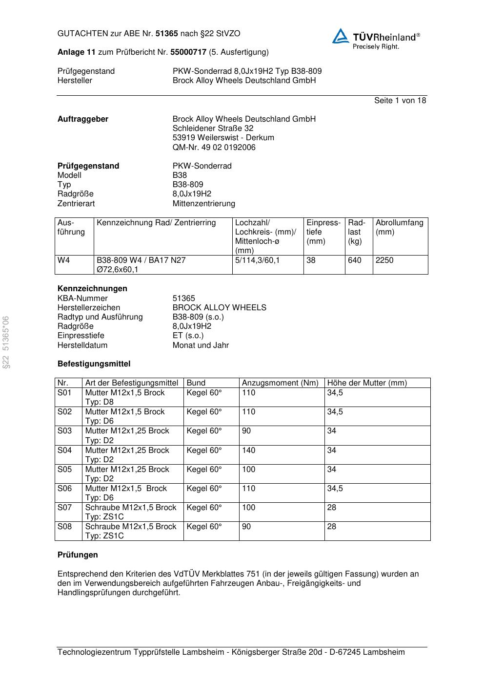 Dieses Gutachten (abe) bezieht sich auf die Alufelge Brock B38-809 in der Ausführung 8Jx19 ET 0, Mittenloch 0 mm (KBA 51365). Im PDF findest du typischerweise zulässige Reifengrößen, Auflagen/Anbauhinweise und – je nach Dokument – Hinweise zur Eintragung.