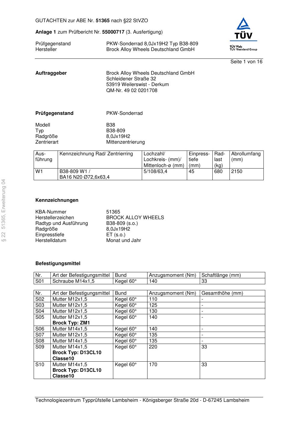 Felgengutachten / abe für Alufelgen Brock B38-809 (8Jx19 ET 0, Mittenloch 0 mm) mit KBA 51365 (Zertifikatsnummer 51365). Hier kostenlos als PDF herunterladen. Der Download-Link ist 24 Stunden gültig und kann bis zu zwei Mal verwendet werden.