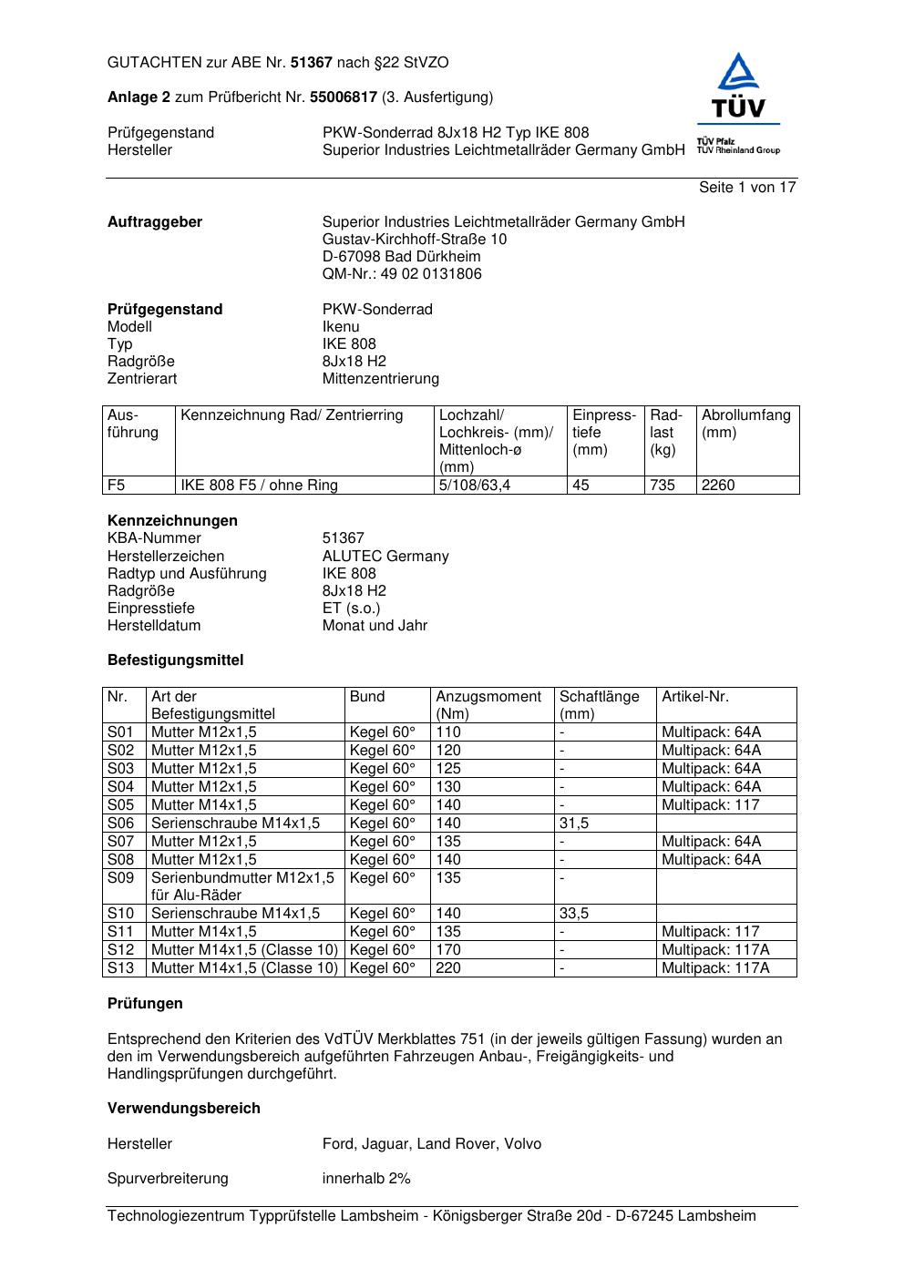 Felgengutachten / abe für Alufelgen ALUTEC IKE 808 (8Jx18 ET 0, Mittenloch 0 mm) mit KBA 51367 (Zertifikatsnummer 51367). Hier kostenlos als PDF herunterladen. Der Download-Link ist 24 Stunden gültig und kann bis zu zwei Mal verwendet werden.