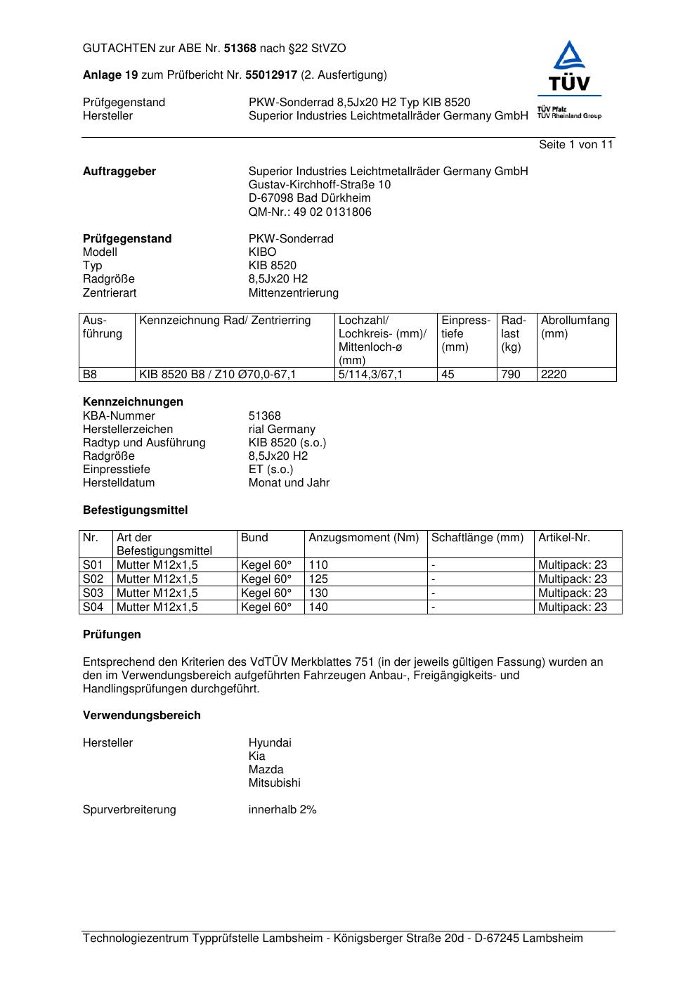 Dieses Gutachten (abe) bezieht sich auf die Alufelge brand-rial KIB 852 0 in der Ausführung 8.5Jx2 ET 0, Mittenloch 0 mm (KBA 51368). Im PDF findest du typischerweise zulässige Reifengrößen, Auflagen/Anbauhinweise und – je nach Dokument – Hinweise zur Eintragung.