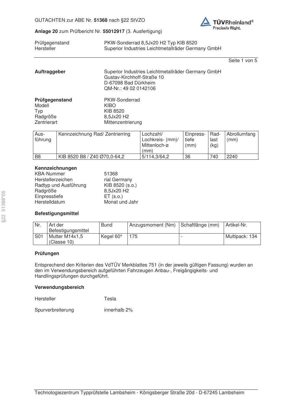 Felgengutachten / abe für Alufelgen brand-rial KIB 852 0 (8.5Jx2 ET 0, Mittenloch 0 mm) mit KBA 51368 (Zertifikatsnummer 51368). Hier kostenlos als PDF herunterladen. Der Download-Link ist 24 Stunden gültig und kann bis zu zwei Mal verwendet werden.