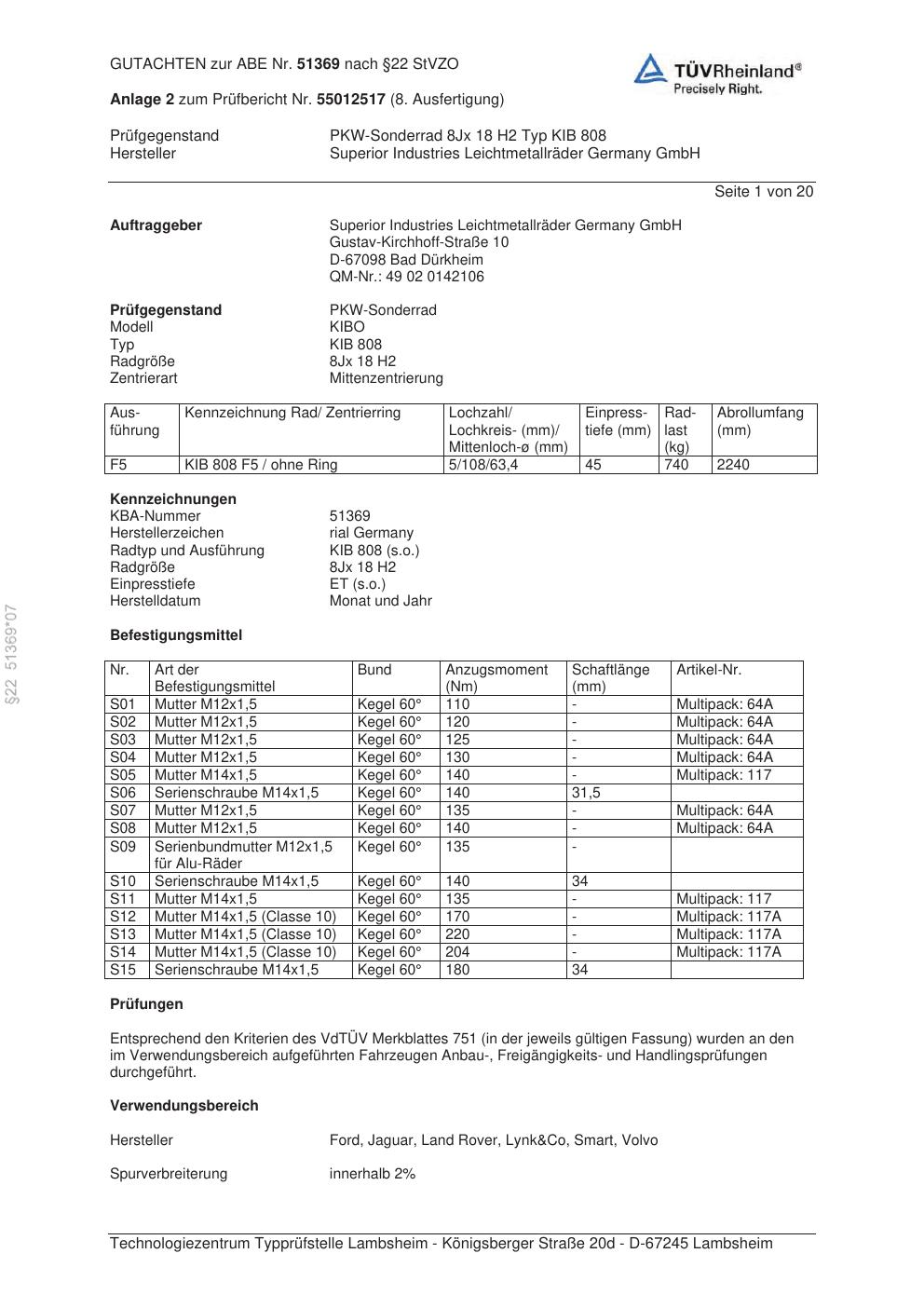 Dieses Gutachten (abe) bezieht sich auf die Alufelge brand-rial KIB 808 in der Ausführung 8Jx18 ET 0, Mittenloch 0 mm (KBA 51369). Im PDF findest du typischerweise zulässige Reifengrößen, Auflagen/Anbauhinweise und – je nach Dokument – Hinweise zur Eintragung.