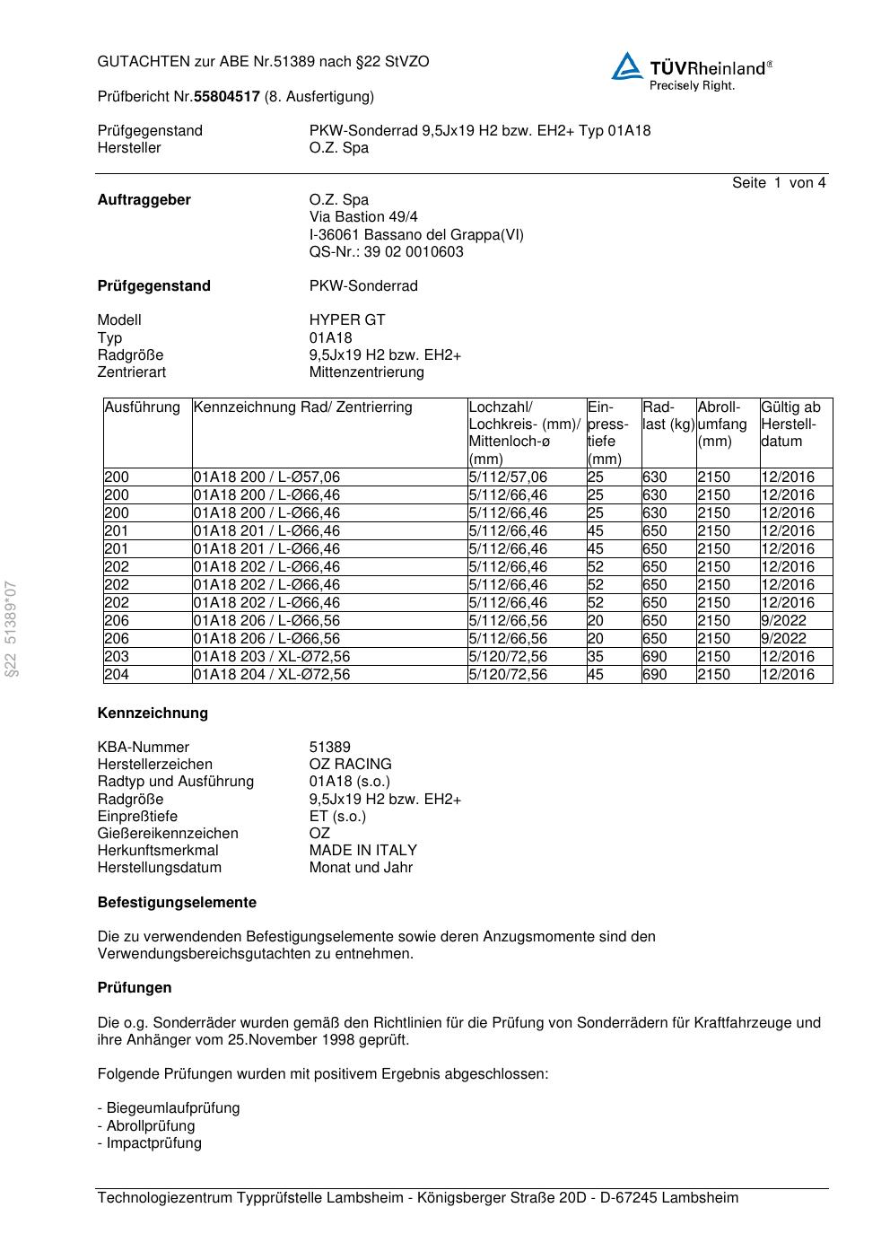 Dieses Gutachten (abe) bezieht sich auf die Alufelge OZ 01A18 in der Ausführung 9.5Jx19 ET 0, Mittenloch 0 mm (KBA 51389). Im PDF findest du typischerweise zulässige Reifengrößen, Auflagen/Anbauhinweise und – je nach Dokument – Hinweise zur Eintragung.