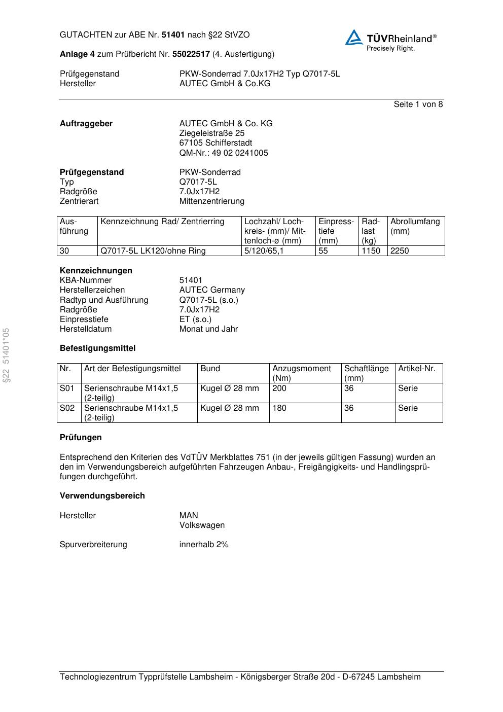Dieses Gutachten (abe) bezieht sich auf die Alufelge Autec Q7017 in der Ausführung 7Jx17 ET 0, Mittenloch 0 mm (KBA 51401). Im PDF findest du typischerweise zulässige Reifengrößen, Auflagen/Anbauhinweise und – je nach Dokument – Hinweise zur Eintragung.