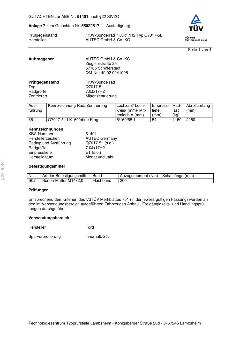 Dieses Gutachten (abe) bezieht sich auf die Alufelge Autec Q7017 in der Ausführung 7Jx17 ET 0, Mittenloch 0 mm (KBA 51401). Im PDF findest du typischerweise zulässige Reifengrößen, Auflagen/Anbauhinweise und – je nach Dokument – Hinweise zur Eintragung.