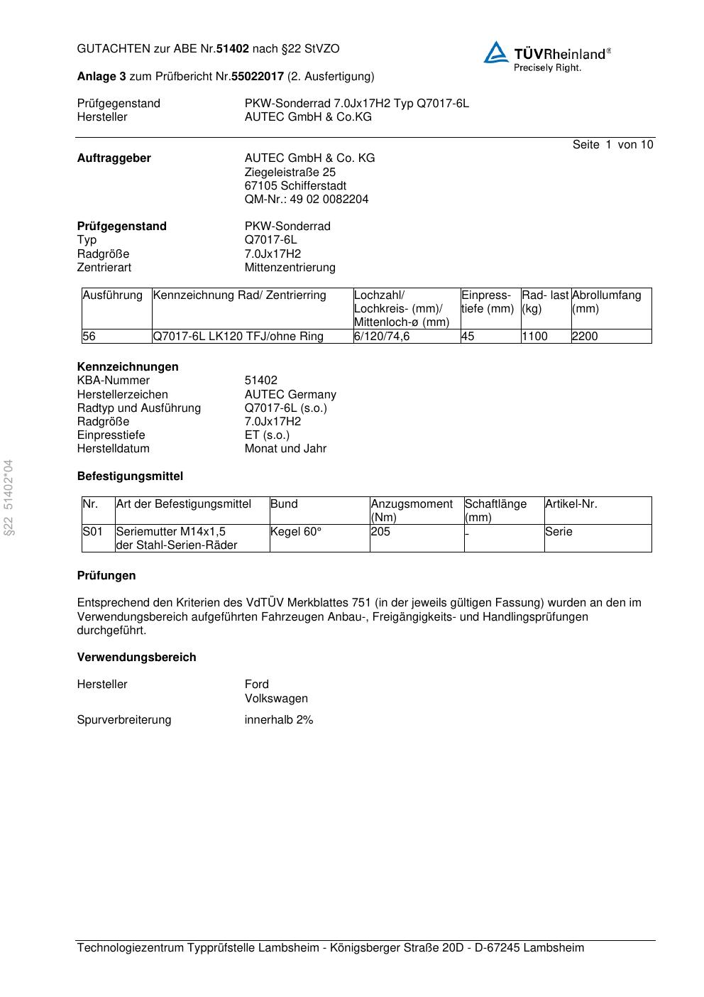 Dieses Gutachten (abe) bezieht sich auf die Alufelge Autec Q7017-6L in der Ausführung 7Jx17 ET 0, Mittenloch 0 mm (KBA 51402). Im PDF findest du typischerweise zulässige Reifengrößen, Auflagen/Anbauhinweise und – je nach Dokument – Hinweise zur Eintragung.