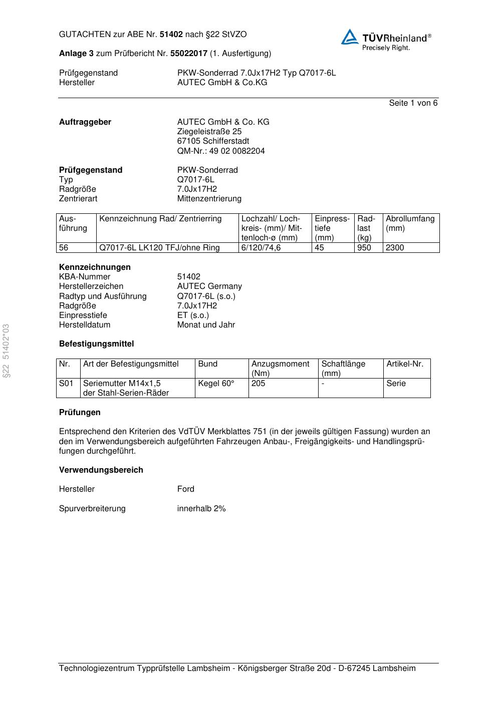 Dieses Gutachten (abe) bezieht sich auf die Alufelge Autec Q7017-6L in der Ausführung 7Jx17 ET 0, Mittenloch 0 mm (KBA 51402). Im PDF findest du typischerweise zulässige Reifengrößen, Auflagen/Anbauhinweise und – je nach Dokument – Hinweise zur Eintragung.