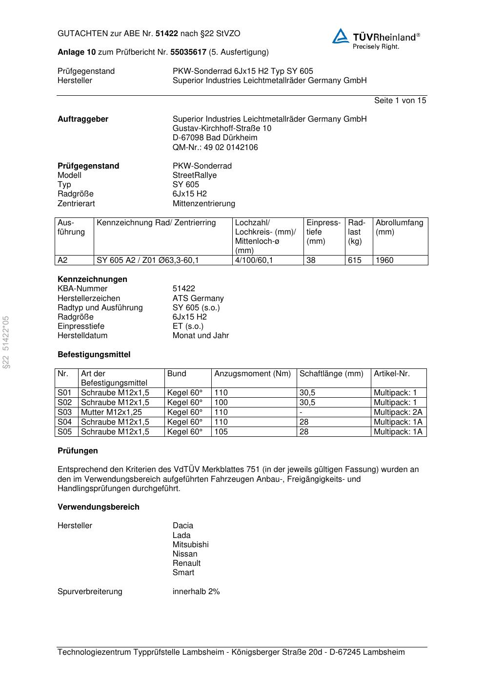Dieses Gutachten (abe) bezieht sich auf die Alufelge ATS SY 605 in der Ausführung 6Jx15 ET 0, Mittenloch 0 mm (KBA 51422). Im PDF findest du typischerweise zulässige Reifengrößen, Auflagen/Anbauhinweise und – je nach Dokument – Hinweise zur Eintragung.