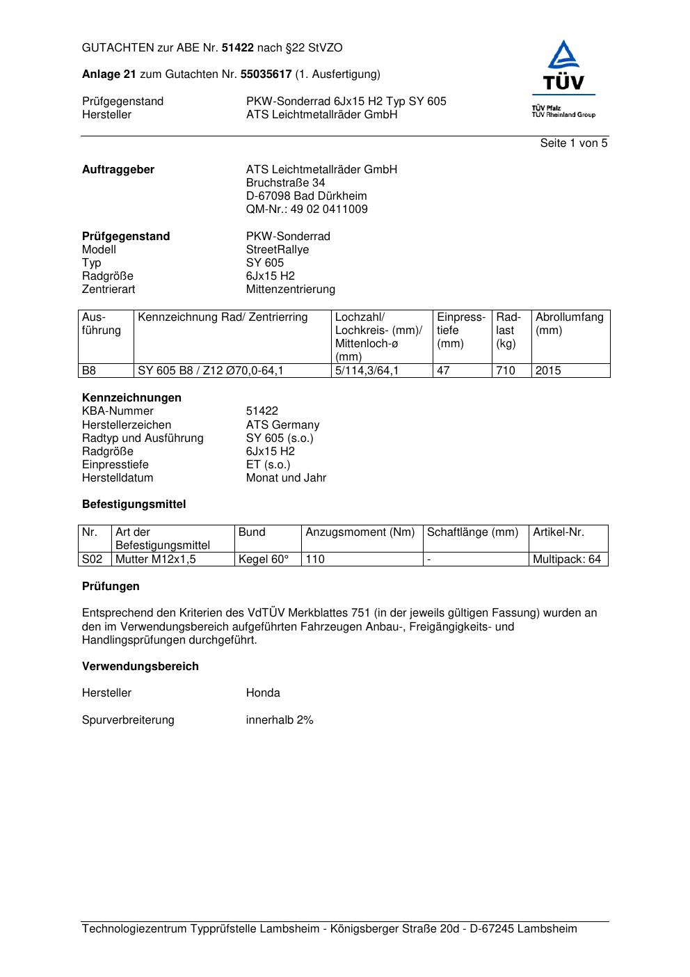 Dieses Gutachten (abe) bezieht sich auf die Alufelge ATS SY 605 in der Ausführung 6Jx15 ET 0, Mittenloch 0 mm (KBA 51422). Im PDF findest du typischerweise zulässige Reifengrößen, Auflagen/Anbauhinweise und – je nach Dokument – Hinweise zur Eintragung.