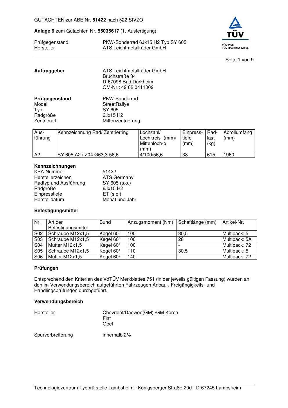 Dieses Gutachten (abe) bezieht sich auf die Alufelge ATS SY 605 in der Ausführung 6Jx15 ET 0, Mittenloch 0 mm (KBA 51422). Im PDF findest du typischerweise zulässige Reifengrößen, Auflagen/Anbauhinweise und – je nach Dokument – Hinweise zur Eintragung.
