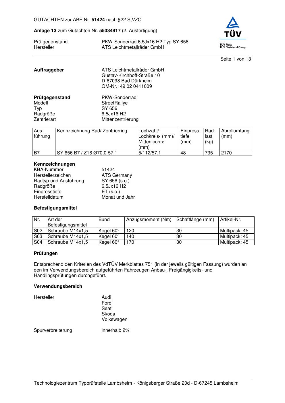 Dieses Gutachten (abe) bezieht sich auf die Alufelge ATS SY 656 in der Ausführung 6.5Jx16 ET 0, Mittenloch 0 mm (KBA 51424). Im PDF findest du typischerweise zulässige Reifengrößen, Auflagen/Anbauhinweise und – je nach Dokument – Hinweise zur Eintragung.