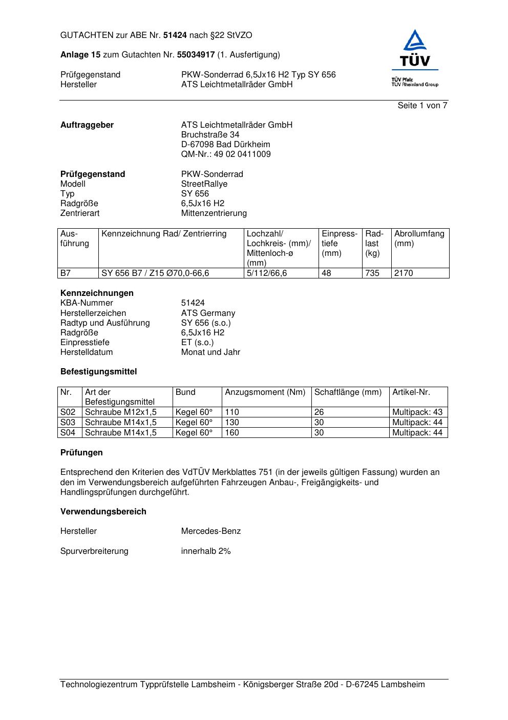 Dieses Gutachten (abe) bezieht sich auf die Alufelge ATS SY 656 in der Ausführung 6.5Jx16 ET 0, Mittenloch 0 mm (KBA 51424). Im PDF findest du typischerweise zulässige Reifengrößen, Auflagen/Anbauhinweise und – je nach Dokument – Hinweise zur Eintragung.