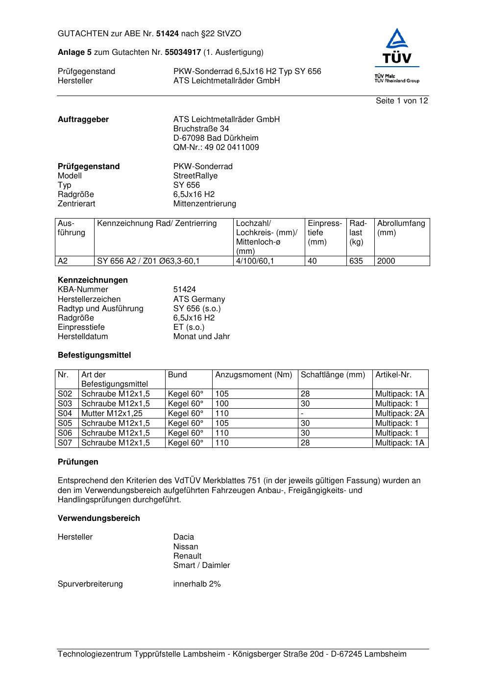 Dieses Gutachten (abe) bezieht sich auf die Alufelge ATS SY 656 in der Ausführung 6.5Jx16 ET 0, Mittenloch 0 mm (KBA 51424). Im PDF findest du typischerweise zulässige Reifengrößen, Auflagen/Anbauhinweise und – je nach Dokument – Hinweise zur Eintragung.