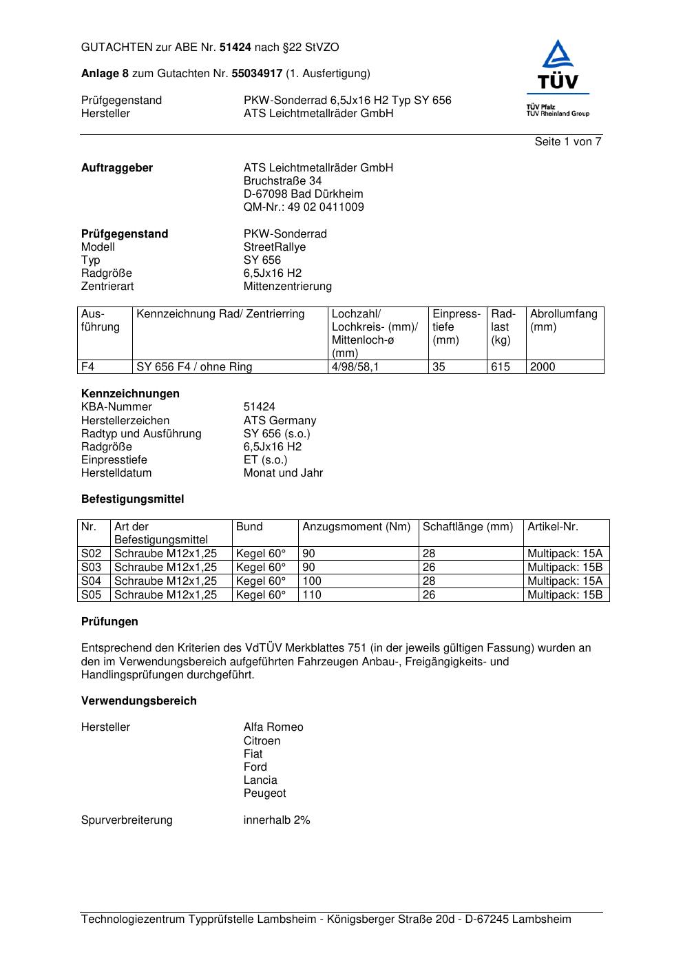 Dieses Gutachten (abe) bezieht sich auf die Alufelge ATS SY 656 in der Ausführung 6.5Jx16 ET 0, Mittenloch 0 mm (KBA 51424). Im PDF findest du typischerweise zulässige Reifengrößen, Auflagen/Anbauhinweise und – je nach Dokument – Hinweise zur Eintragung.