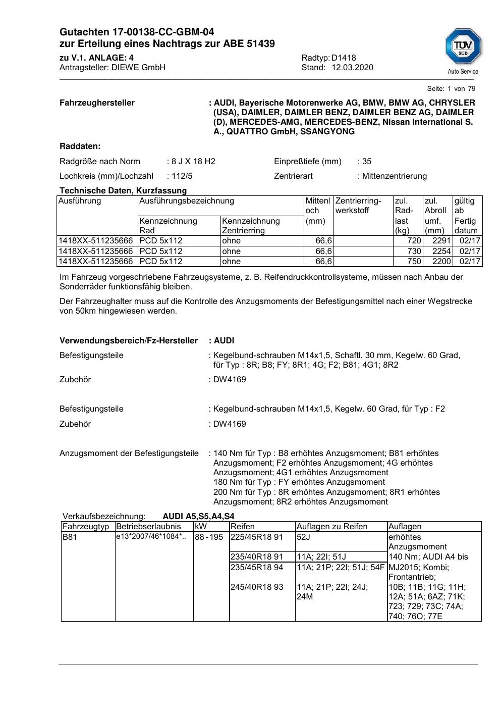 Dieses Gutachten (abe) bezieht sich auf die Alufelge ATS D1418 in der Ausführung 8Jx18 ET 0, Mittenloch 0 mm (KBA 51439). Im PDF findest du typischerweise zulässige Reifengrößen, Auflagen/Anbauhinweise und – je nach Dokument – Hinweise zur Eintragung.