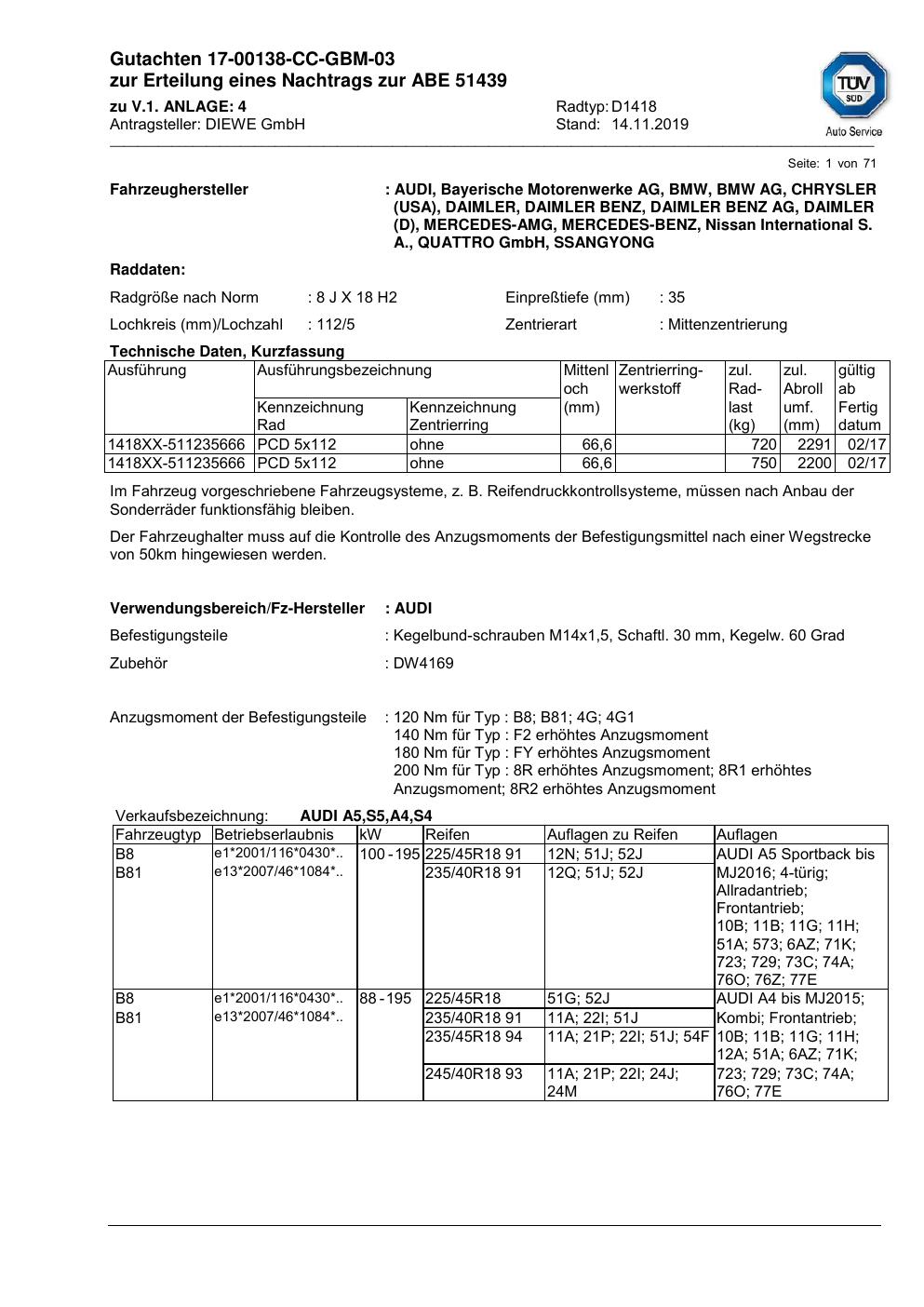 Dieses Gutachten (abe) bezieht sich auf die Alufelge co-diewe D1418 in der Ausführung 8Jx18 ET 0, Mittenloch 0 mm (KBA 51439). Im PDF findest du typischerweise zulässige Reifengrößen, Auflagen/Anbauhinweise und – je nach Dokument – Hinweise zur Eintragung.