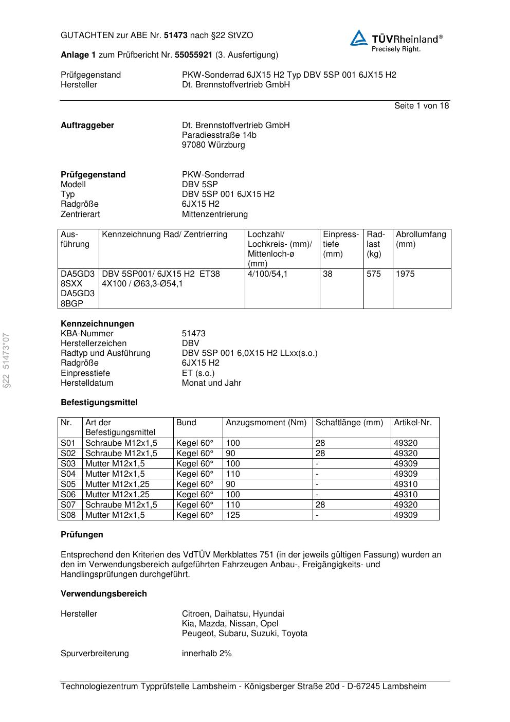 Dieses Gutachten (abe) bezieht sich auf die Alufelge ATS DBV 5SP 0 01 6JX15 H2 in der Ausführung 6Jx15 ET 0, Mittenloch 0 mm (KBA 51473). Im PDF findest du typischerweise zulässige Reifengrößen, Auflagen/Anbauhinweise und – je nach Dokument – Hinweise zur Eintragung.