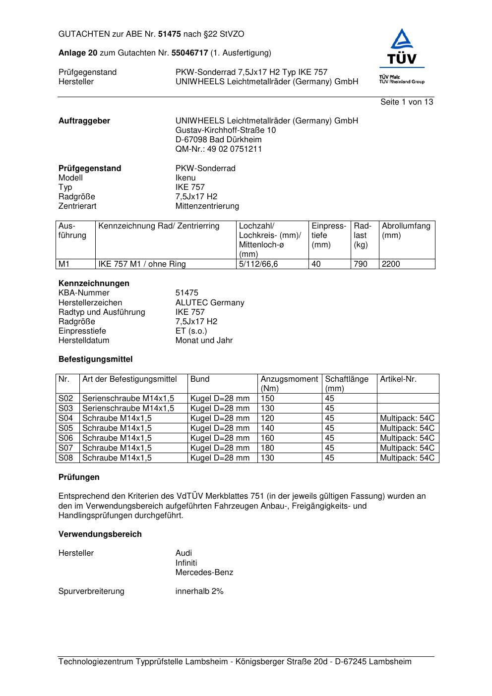 Dieses Gutachten (abe) bezieht sich auf die Alufelge ALUTEC IKE 757 in der Ausführung 7.5Jx17 ET 0, Mittenloch 0 mm (KBA 51475). Im PDF findest du typischerweise zulässige Reifengrößen, Auflagen/Anbauhinweise und – je nach Dokument – Hinweise zur Eintragung.