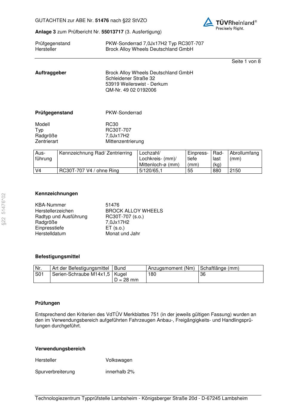 Dieses Gutachten (abe) bezieht sich auf die Alufelge Brock RC30T-70 7 in der Ausführung 7Jx17 ET 0, Mittenloch 0 mm (KBA 51476). Im PDF findest du typischerweise zulässige Reifengrößen, Auflagen/Anbauhinweise und – je nach Dokument – Hinweise zur Eintragung.