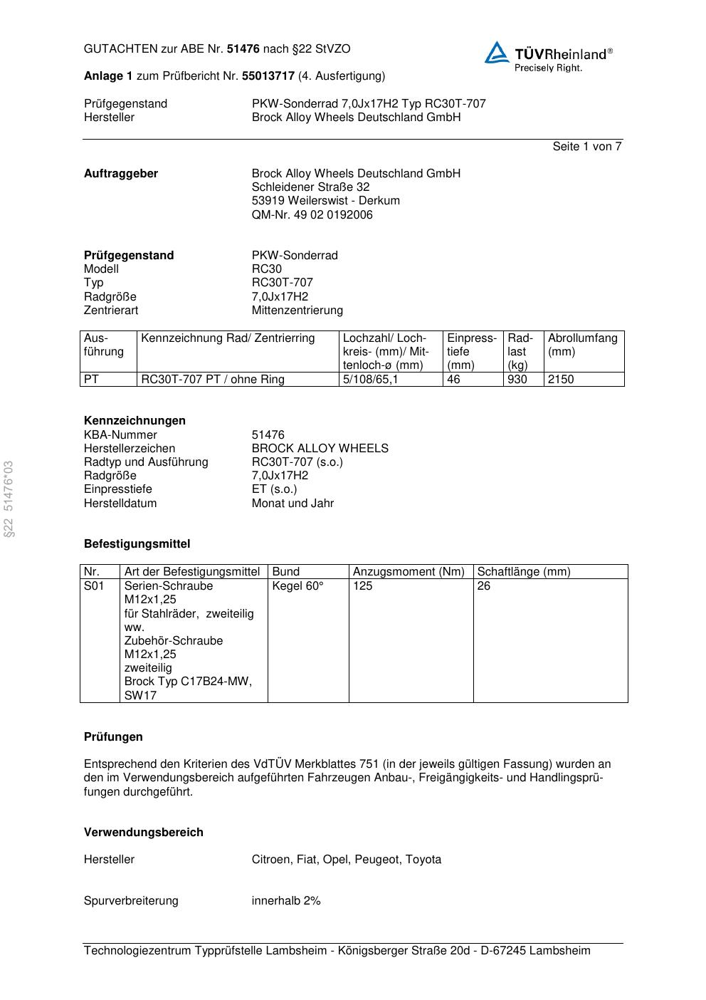Dieses Gutachten (abe) bezieht sich auf die Alufelge Brock RC30T-70 7 in der Ausführung 7Jx17 ET 0, Mittenloch 0 mm (KBA 51476). Im PDF findest du typischerweise zulässige Reifengrößen, Auflagen/Anbauhinweise und – je nach Dokument – Hinweise zur Eintragung.
