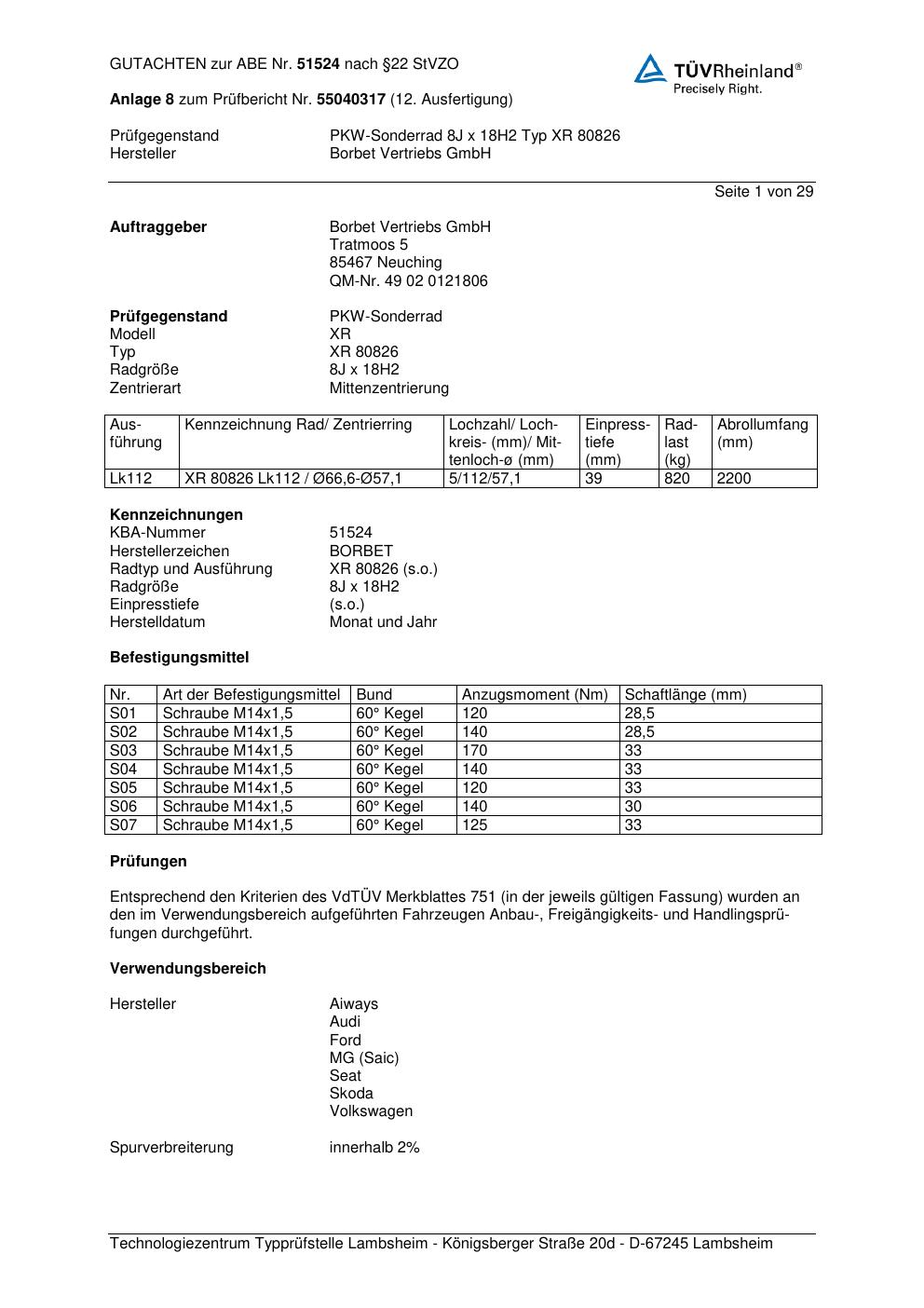 Dieses Gutachten (abe) bezieht sich auf die Alufelge Borbet XR 80826 in der Ausführung 8Jx18 ET 0, Mittenloch 0 mm (KBA 51524). Im PDF findest du typischerweise zulässige Reifengrößen, Auflagen/Anbauhinweise und – je nach Dokument – Hinweise zur Eintragung.