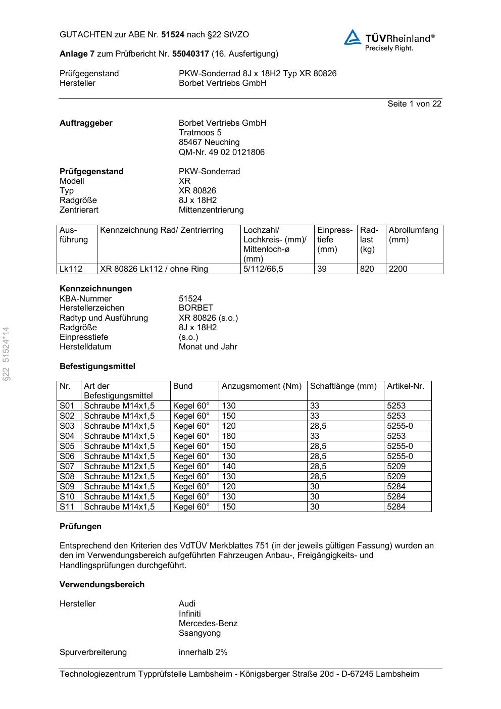 Dieses Gutachten (abe) bezieht sich auf die Alufelge Borbet XR 80826 in der Ausführung 8Jx18 ET 0, Mittenloch 0 mm (KBA 51524). Im PDF findest du typischerweise zulässige Reifengrößen, Auflagen/Anbauhinweise und – je nach Dokument – Hinweise zur Eintragung.