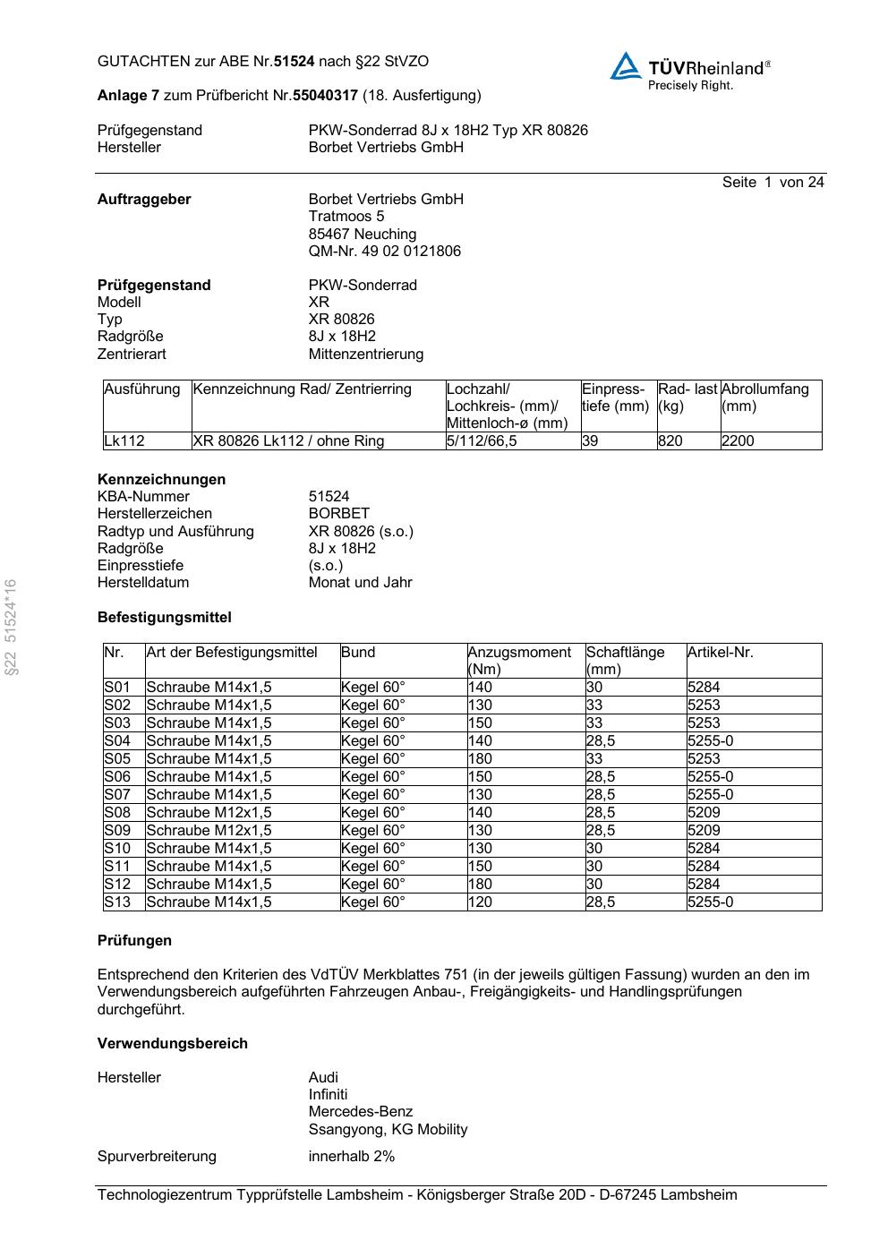 Dieses Gutachten (abe) bezieht sich auf die Alufelge Borbet XR 80826 in der Ausführung 8Jx18 ET 0, Mittenloch 0 mm (KBA 51524). Im PDF findest du typischerweise zulässige Reifengrößen, Auflagen/Anbauhinweise und – je nach Dokument – Hinweise zur Eintragung.