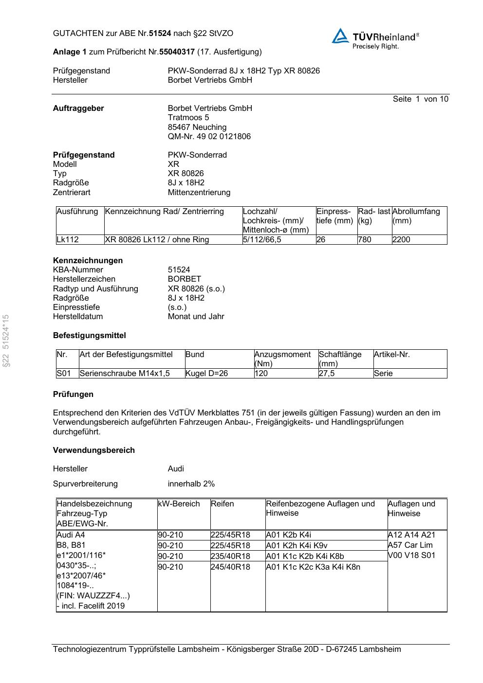 Dieses Gutachten (abe) bezieht sich auf die Alufelge Borbet XR 80826 in der Ausführung 8Jx18 ET 0, Mittenloch 0 mm (KBA 51524). Im PDF findest du typischerweise zulässige Reifengrößen, Auflagen/Anbauhinweise und – je nach Dokument – Hinweise zur Eintragung.