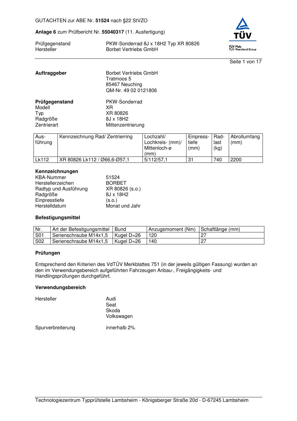 Dieses Gutachten (abe) bezieht sich auf die Alufelge Borbet XR 80826 in der Ausführung 8Jx18 ET 0, Mittenloch 0 mm (KBA 51524). Im PDF findest du typischerweise zulässige Reifengrößen, Auflagen/Anbauhinweise und – je nach Dokument – Hinweise zur Eintragung.