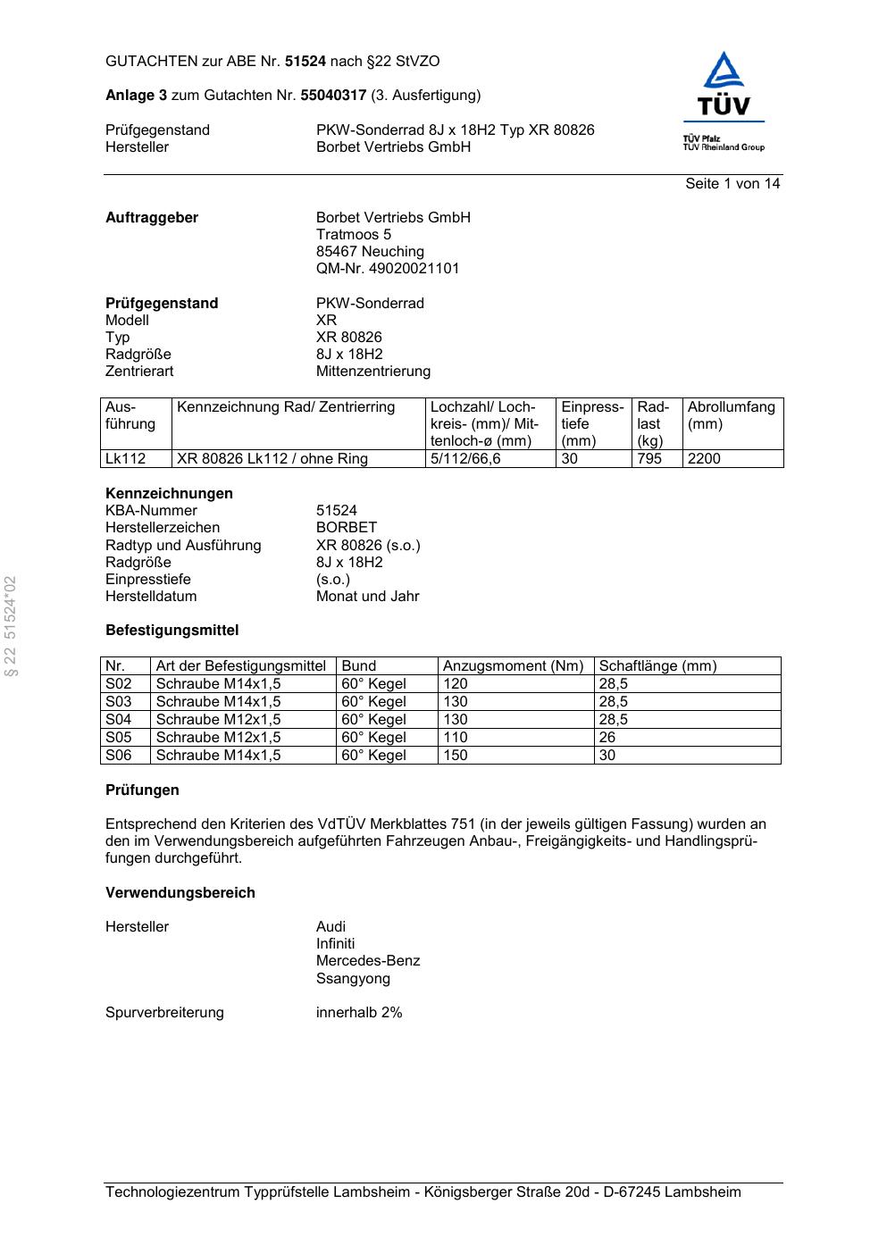 Dieses Gutachten (abe) bezieht sich auf die Alufelge Borbet XR 80826 in der Ausführung 8Jx18 ET 0, Mittenloch 0 mm (KBA 51524). Im PDF findest du typischerweise zulässige Reifengrößen, Auflagen/Anbauhinweise und – je nach Dokument – Hinweise zur Eintragung.