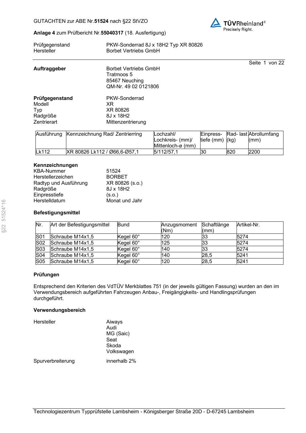 Dieses Gutachten (abe) bezieht sich auf die Alufelge Borbet XR 80826 in der Ausführung 8Jx18 ET 0, Mittenloch 0 mm (KBA 51524). Im PDF findest du typischerweise zulässige Reifengrößen, Auflagen/Anbauhinweise und – je nach Dokument – Hinweise zur Eintragung.