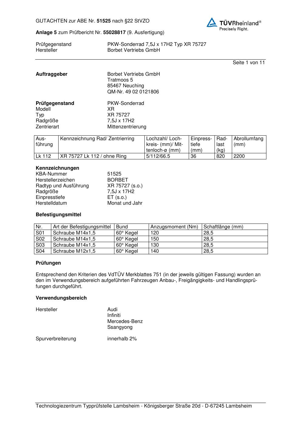 Dieses Gutachten (abe) bezieht sich auf die Alufelge Borbet XR 757 27 in der Ausführung 7.5Jx17 ET 0, Mittenloch 0 mm (KBA 51525). Im PDF findest du typischerweise zulässige Reifengrößen, Auflagen/Anbauhinweise und – je nach Dokument – Hinweise zur Eintragung.