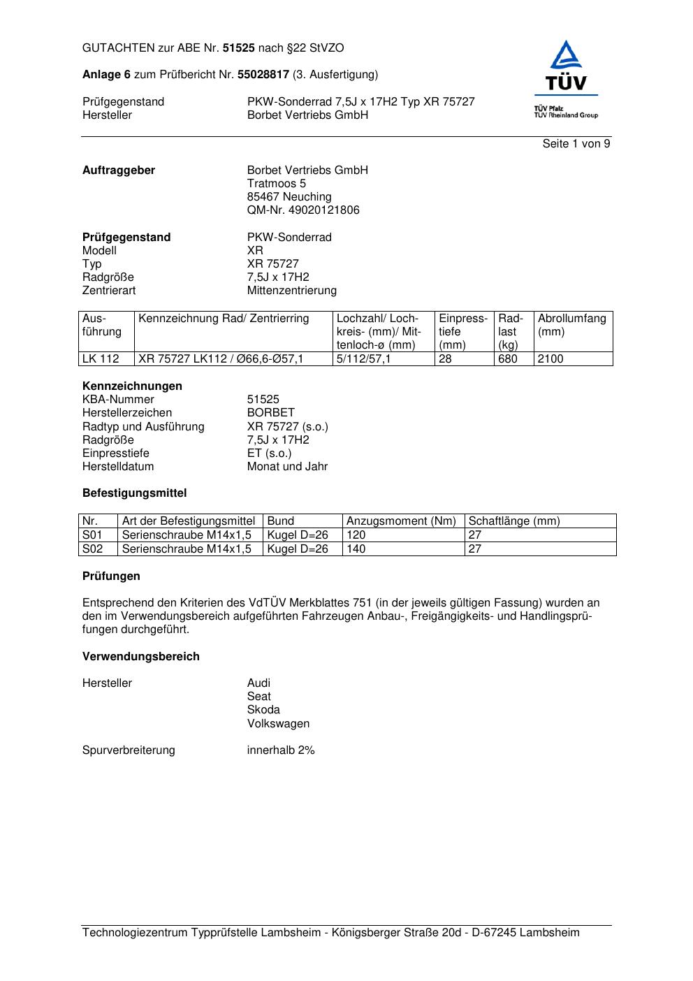 Dieses Gutachten (abe) bezieht sich auf die Alufelge Borbet XR 757 27 in der Ausführung 7.5Jx17 ET 0, Mittenloch 0 mm (KBA 51525). Im PDF findest du typischerweise zulässige Reifengrößen, Auflagen/Anbauhinweise und – je nach Dokument – Hinweise zur Eintragung.