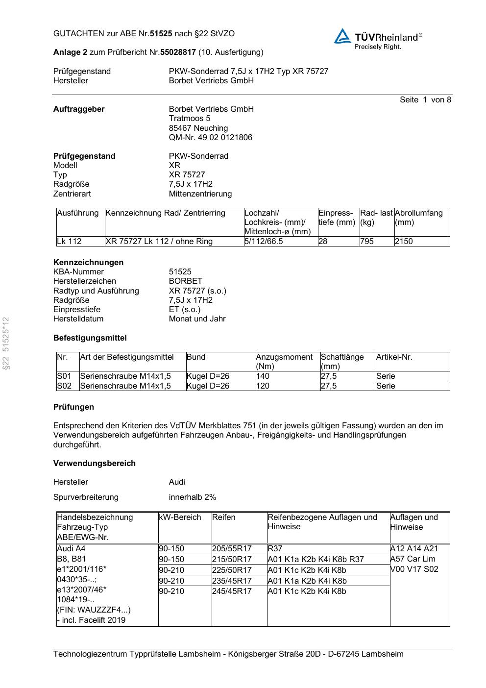 Dieses Gutachten (abe) bezieht sich auf die Alufelge Borbet XR 75727 in der Ausführung 7.5Jx17 ET 0, Mittenloch 0 mm (KBA 51525). Im PDF findest du typischerweise zulässige Reifengrößen, Auflagen/Anbauhinweise und – je nach Dokument – Hinweise zur Eintragung.