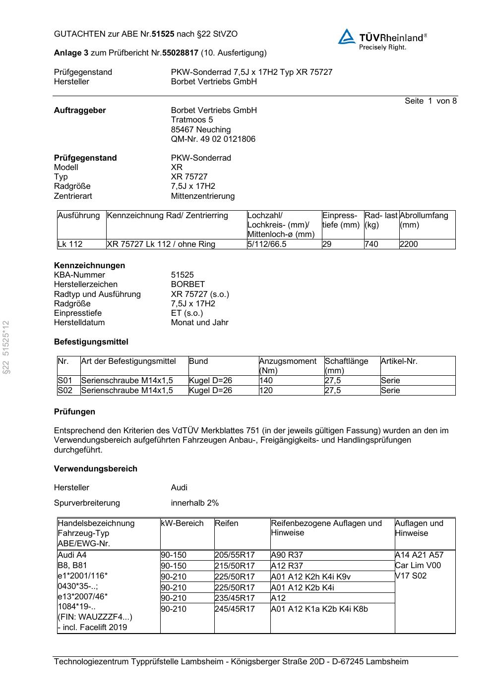 Dieses Gutachten (abe) bezieht sich auf die Alufelge Borbet XR 75727 in der Ausführung 7.5Jx17 ET 0, Mittenloch 0 mm (KBA 51525). Im PDF findest du typischerweise zulässige Reifengrößen, Auflagen/Anbauhinweise und – je nach Dokument – Hinweise zur Eintragung.