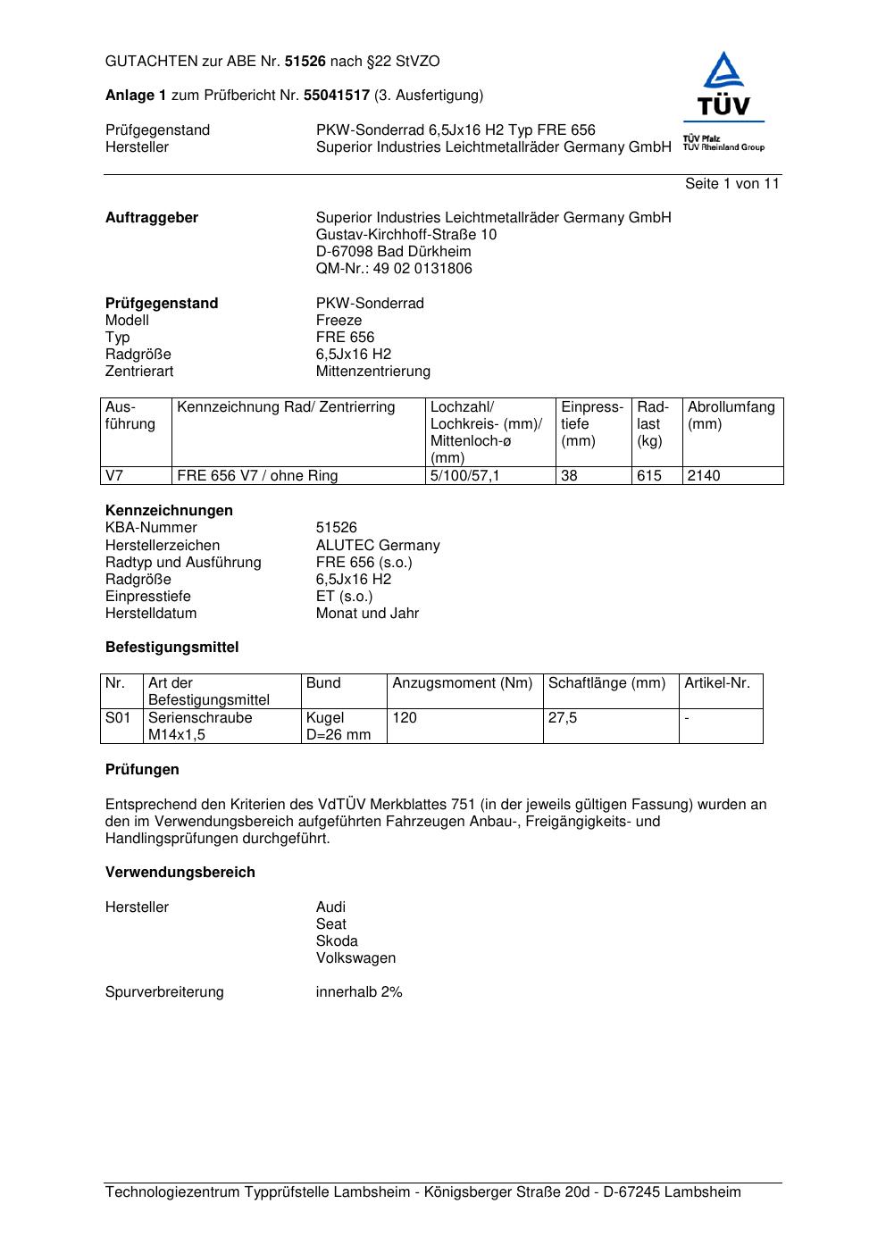 Dieses Gutachten (abe) bezieht sich auf die Alufelge ALUTEC FRE 656 in der Ausführung 6.5Jx16 ET 0, Mittenloch 0 mm (KBA 51526). Im PDF findest du typischerweise zulässige Reifengrößen, Auflagen/Anbauhinweise und – je nach Dokument – Hinweise zur Eintragung.