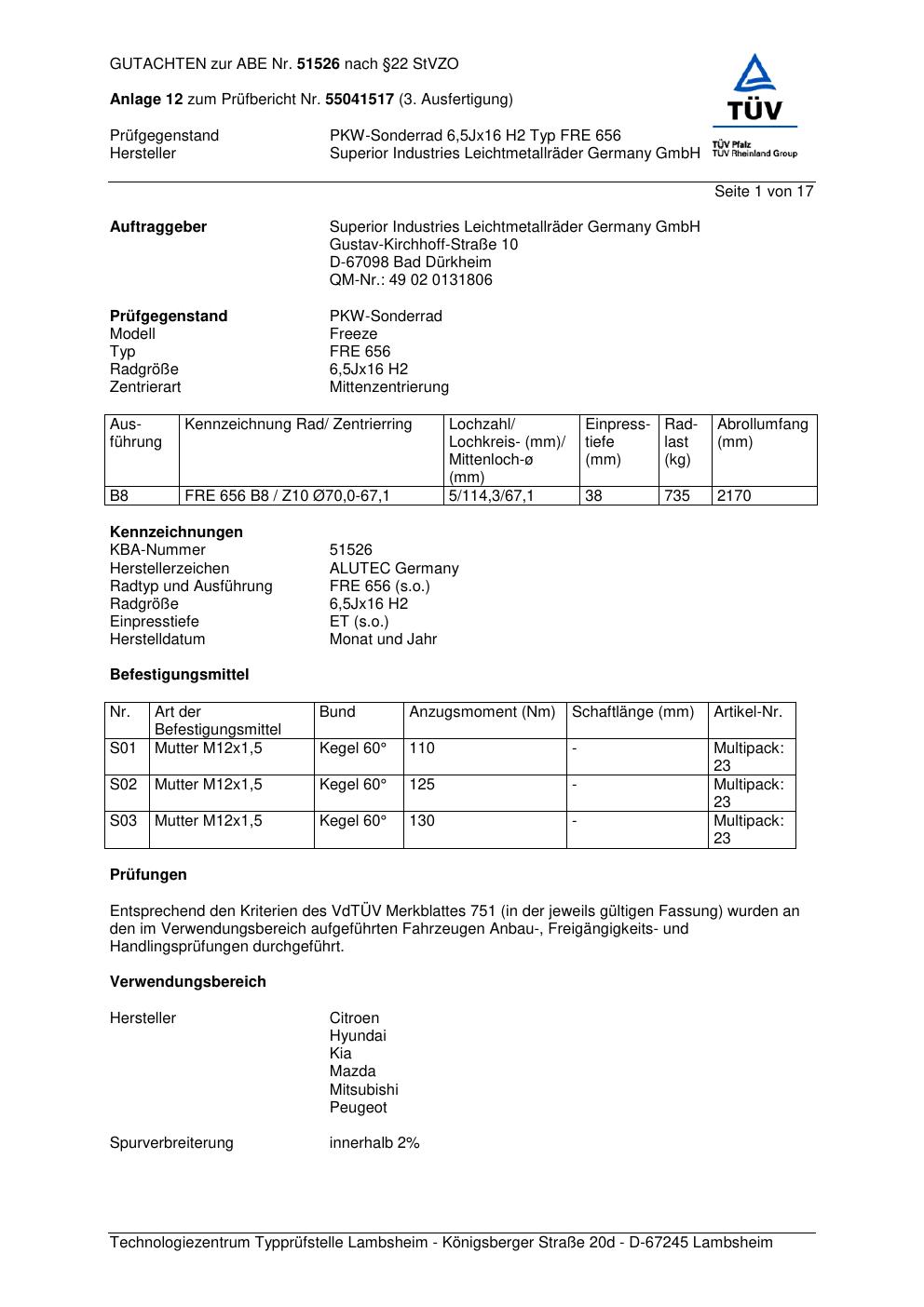 Dieses Gutachten (abe) bezieht sich auf die Alufelge ALUTEC FRE 656 in der Ausführung 6.5Jx16 ET 0, Mittenloch 0 mm (KBA 51526). Im PDF findest du typischerweise zulässige Reifengrößen, Auflagen/Anbauhinweise und – je nach Dokument – Hinweise zur Eintragung.