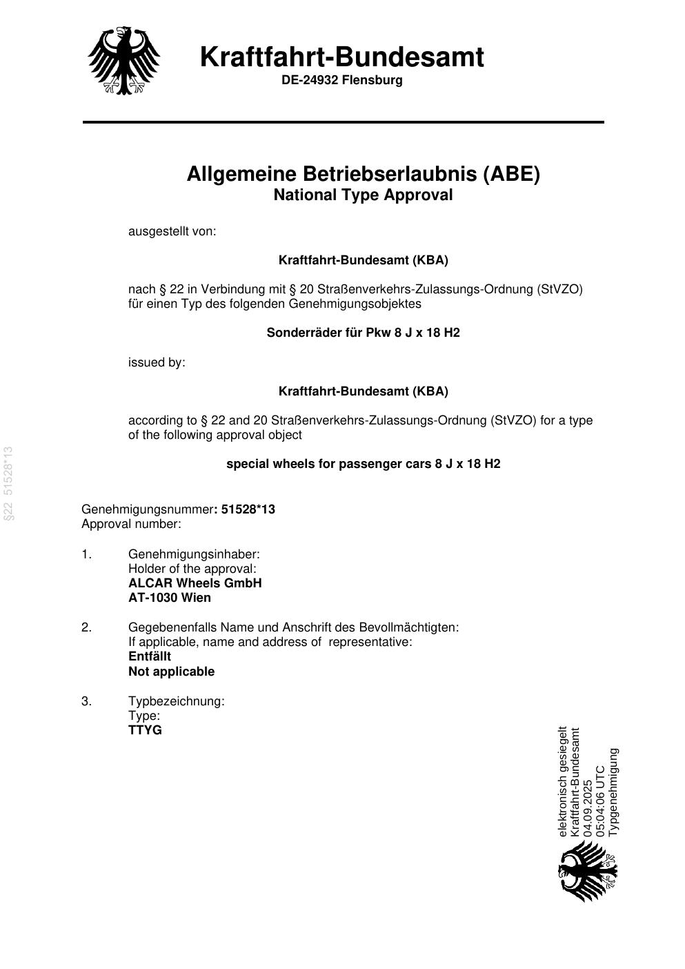 Dieses Gutachten (abe) bezieht sich auf die Alufelge ATS UN8080 in der Ausführung 8Jx18 ET 0, Mittenloch 0 mm (KBA 51528). Im PDF findest du typischerweise zulässige Reifengrößen, Auflagen/Anbauhinweise und – je nach Dokument – Hinweise zur Eintragung.