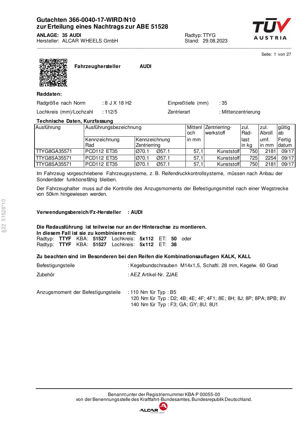 Dieses Gutachten (abe) bezieht sich auf die Alufelge alcar TTYG in der Ausführung 8Jx18 ET 0, Mittenloch 0 mm (KBA 51528). Im PDF findest du typischerweise zulässige Reifengrößen, Auflagen/Anbauhinweise und – je nach Dokument – Hinweise zur Eintragung.