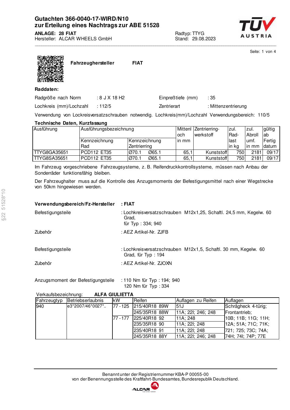 Dieses Gutachten (abe) bezieht sich auf die Alufelge alcar TTYG in der Ausführung 8Jx18 ET 0, Mittenloch 0 mm (KBA 51528). Im PDF findest du typischerweise zulässige Reifengrößen, Auflagen/Anbauhinweise und – je nach Dokument – Hinweise zur Eintragung.