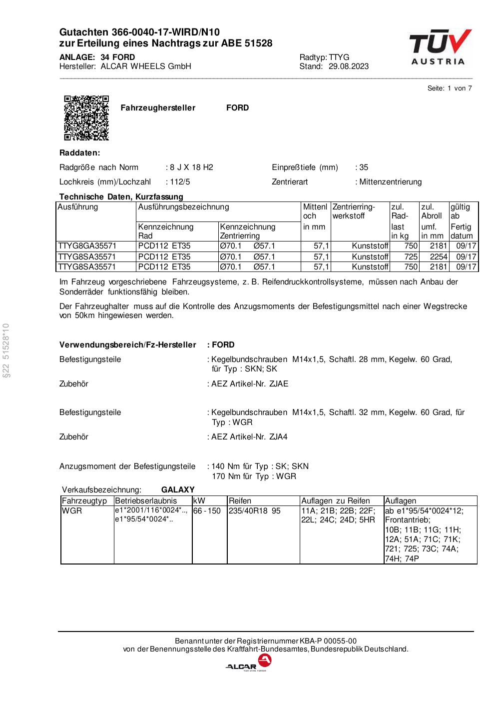 Dieses Gutachten (abe) bezieht sich auf die Alufelge alcar TTYG in der Ausführung 8Jx18 ET 0, Mittenloch 0 mm (KBA 51528). Im PDF findest du typischerweise zulässige Reifengrößen, Auflagen/Anbauhinweise und – je nach Dokument – Hinweise zur Eintragung.