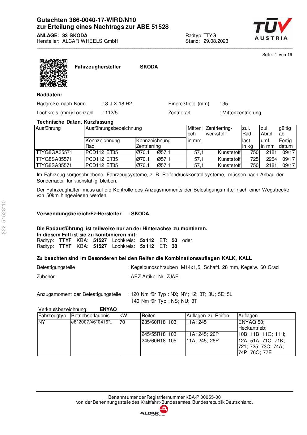 Dieses Gutachten (abe) bezieht sich auf die Alufelge alcar TTYG in der Ausführung 8Jx18 ET 0, Mittenloch 0 mm (KBA 51528). Im PDF findest du typischerweise zulässige Reifengrößen, Auflagen/Anbauhinweise und – je nach Dokument – Hinweise zur Eintragung.